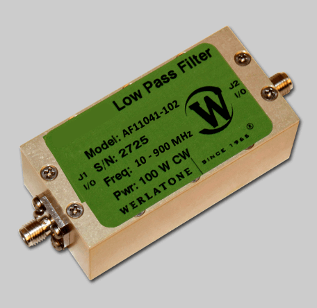 Absorptive Filters – AF11041 Low Pass Absorptive Filter covers the full 10-900 MHz band rated at 100 W CW. Absorptive Filters – AF11041 is non-reflective, allowing in-band signals to pass through the filter, while internally terminating out-of-band signals. The AF11041 offers a pass band of 10-900 MHz and stop band of 1700-4000 MHz. The unit operates with better than 53 dB Rejection and less than 0.6 dB of Insertion Loss. The unit measures 2.5 x 1.265 x 1.0″ with a variety of connectors connectors. Above all, Werlatone Absorptive Filters operate with low loss and eliminate the risk of damage to your power amplifiers due to high-power energies outside your band.
