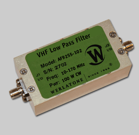Absorptive Filters – AF9255 Low Pass Absorptive Filter covers the full 10-170 MHz band rated at 50 W CW. Absorptive Filters – AF9255 is non-reflective, allowing in-band signals to pass through the filter, while internally terminating out-of-band signals. The AF9255 offers a pass band of 10-170 MHz and stop band of 300-1500 MHz. The unit operates with better than 50 dB Rejection and less than 0.6 dB of Insertion Loss. The unit measures 2.5 x 1.265 x 1.0″ with all SMA-F connectors. Above all, Werlatone Absorptive Filters operate with low loss and eliminate the risk of damage to your power amplifiers due to high-power energies outside your band.