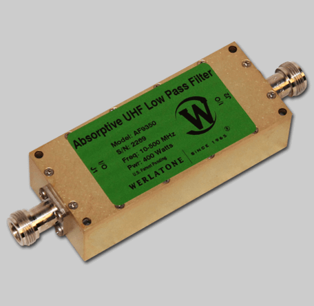 Absorptive Filters – AF9350 Low Pass Absorptive Filter covers the full 10-500 MHz band rated at 400 W CW. Absorptive Filters – AF9350 is non-reflective, allowing in-band signals to pass through the filter, while internally terminating out-of-band signals. The AF9350 offers a pass band of 10-500 MHz and stop band of 501-5000 MHz. The unit operates with better than 45 dB Rejection and less than 0.5 dB of Insertion Loss. The unit measures 4.2 x 1.75 x 1.13″ with a variety of connectors. Above all, Werlatone Absorptive Filters operate with low loss and eliminate the risk of damage to your power amplifiers due to high-power energies outside your band.