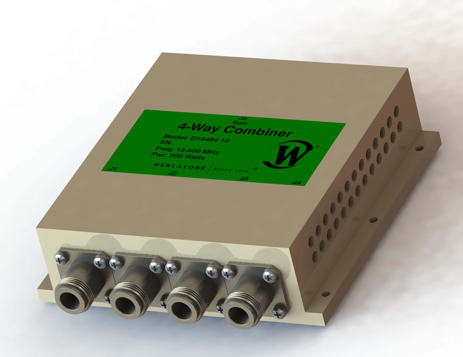 RF Combiner – Model D10484 – 4-Way In-Phase Connectorized Combiner covers the full 15-500 MHz band rated at 200 W CW. RF Combiner – Model D10484 supports military and commercial applications and operates with less than 0.5 dB of Insertion Loss. The D10484 operates with better than 20 dB Isolation. Choose your specific connector configurations from a list of options. Additional connector configurations for our RF Combiners and RF Dividers, Non-Coherent Combiners and N-Way Combiners are available upon request. Above all, Werlatone RF Combiners handle the most stringent operating conditions.