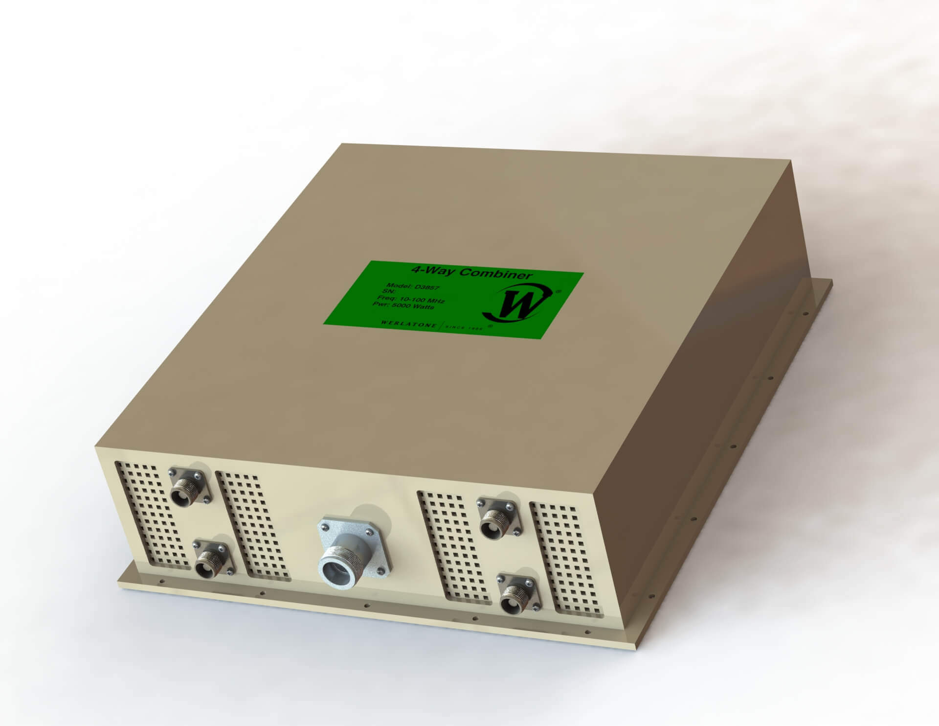 RF Combiner – Model D3857 – 4-Way In-Phase Connectorized Combiner covers the full 10-100 MHz band rated at 5000 W CW. RF Combiner- Model D3857 supports military and commercial applications and operates with less than 0.6 dB of Insertion Loss. The D3857 operates with better than 18 dB Isolation. Choose your specific connector configurations from a list of options. Additional connector configurations for our RF Combiners and RF Dividers, Non-Coherent Combiners and N-Way Combiners are available upon request. Above all, Werlatone RF Combiners handle the most stringent operating conditions.
