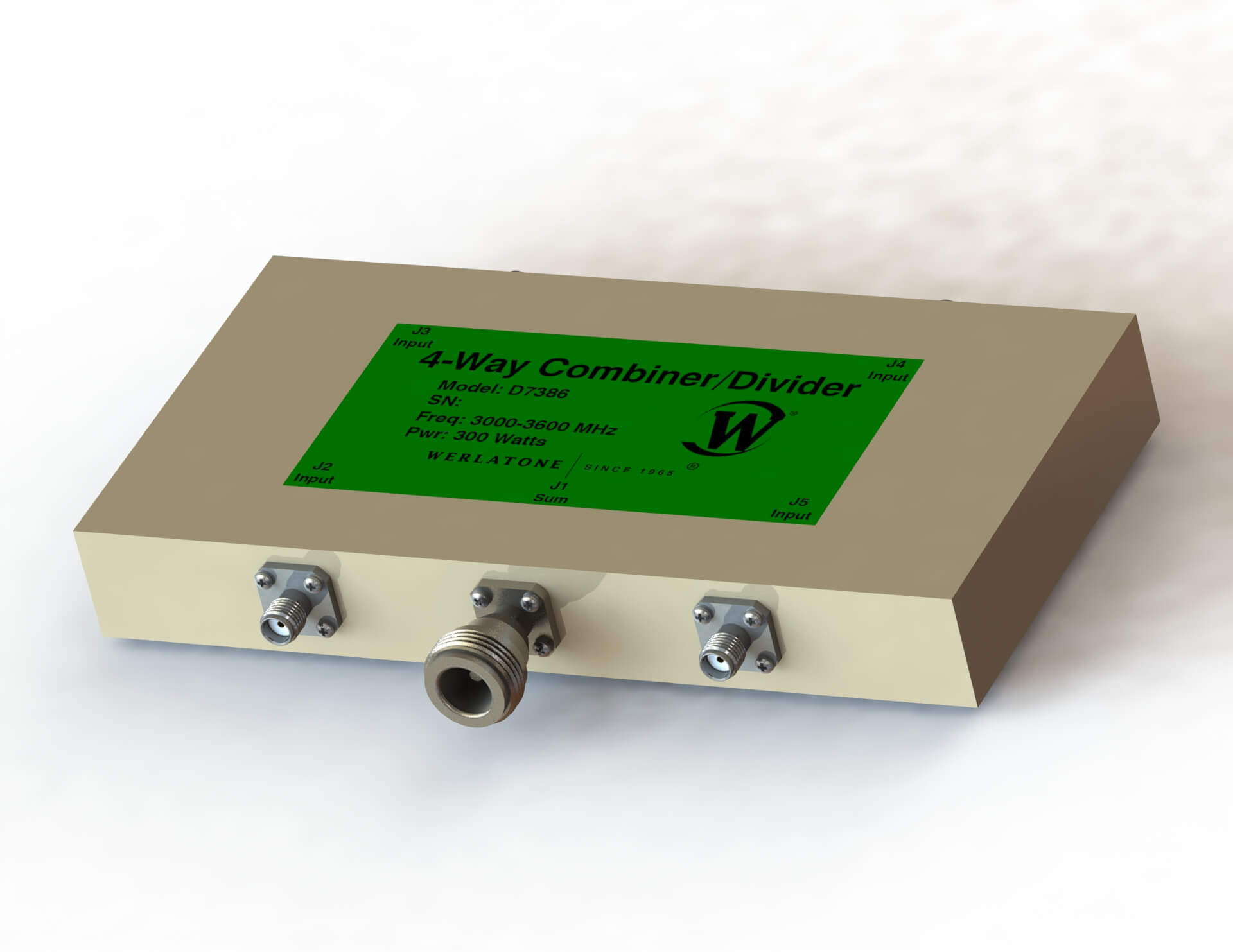 RF Combiner – Model D7386 – 4-Way In-Phase Connectorized Combiner covers the full 3000-3600 MHz band rated at 300 W CW. RF Combiner- Model D7386 supports military and commercial applications and operates with less than 0.5 dB of Insertion Loss. The D7386 operates with better than 15 dB Isolation. Choose your specific connector configurations from a list of options. Additional connector configurations for our RF Combiners and RF Dividers, Non-Coherent Combiners and N-Way Combiners are available upon request. Above all, Werlatone RF Combiners handle the most stringent operating conditions.