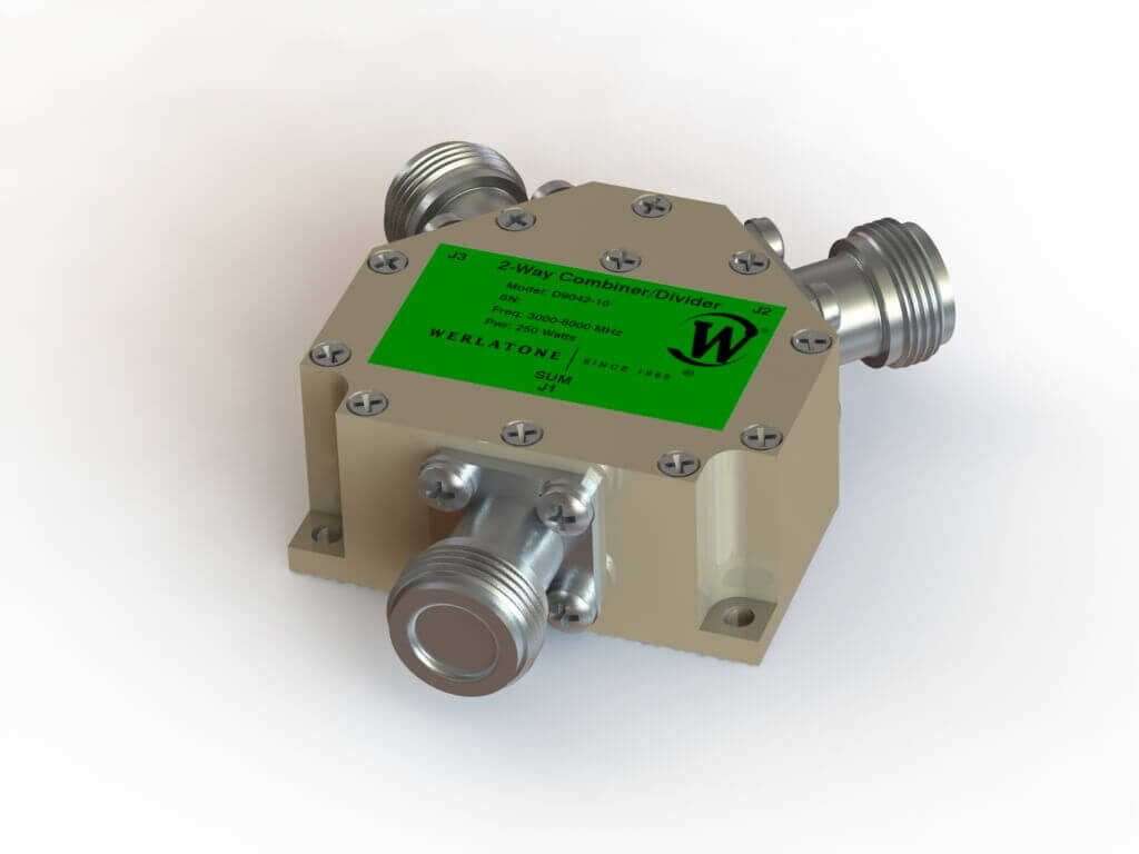 RF Combiner – Model D9042 – 2-Way In-Phase Connectorized Combiner covers the full 3000-6000 MHz band rated at 250 W CW. RF Combiner- Model D9042 supports military and commercial applications and operates with less than 0.35 dB of Insertion Loss. The D9042 operates with better than 15 dB Isolation. Choose your specific connector configurations from a list of options. Additional connector configurations for our RF Combiners and RF Dividers, Non-Coherent Combiners and N-Way Combiners are available upon request. Above all, Werlatone RF Combiners handle the most stringent operating conditions.