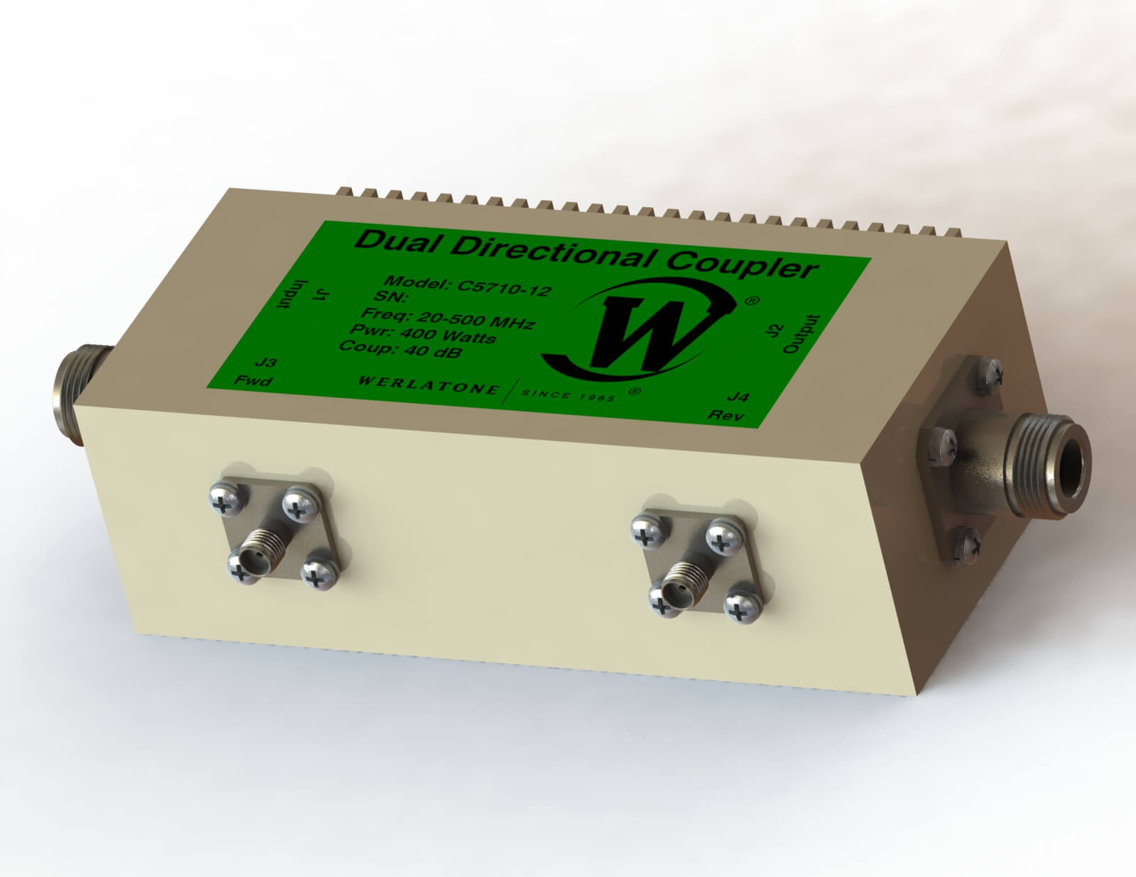 RF Coupler – Model C5710 – Dual Directional Coupler is a High Power design. The unit operates with 40 dB Coupling, covers the full 20-500 MHz band rated at 400 W CW. RF Coupler – Model C5710 supports military and commercial applications and operates with less than 0.35 dB of Insertion Loss and better than ± 0.5 dB of Coupling Flatness. The unit is available with a variety of mainline and coupled port connectors. Werlatone Directional Couplers are broadband Dual, Uni, and Bi-Directional. Above all, our high power designs tolerate the most harsh operating conditions associated with military and EMC testing environments.