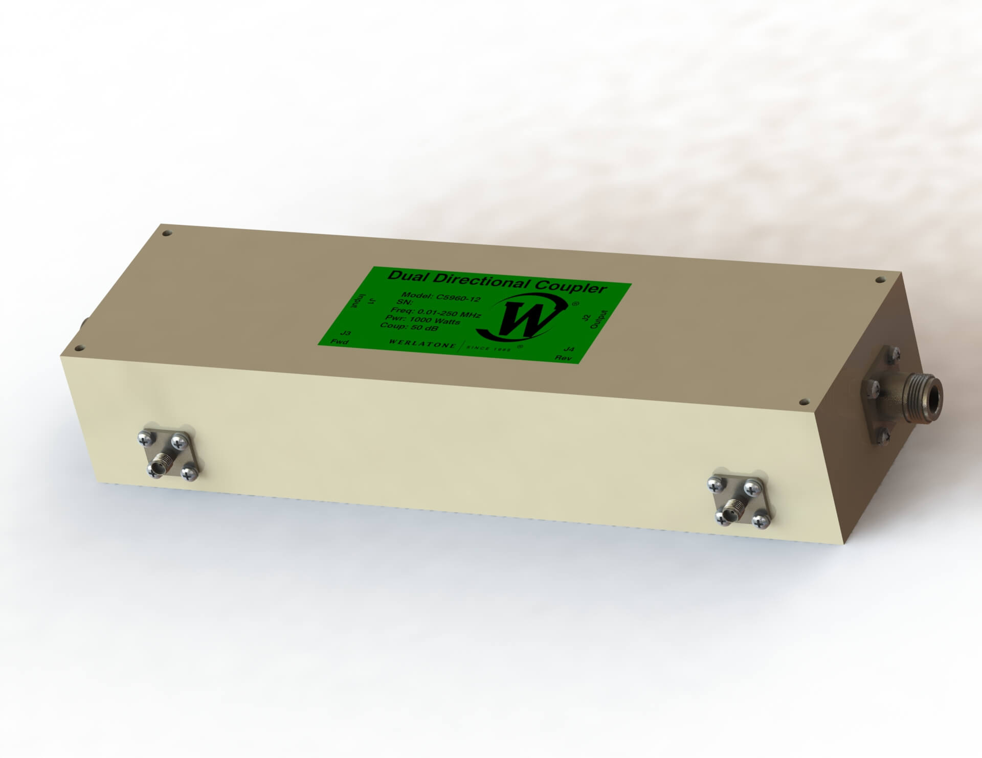 RF Coupler – Model C5960 – Dual Directional Coupler is a High Power design. The unit operates with 50 dB Coupling, covers the full 0.01-250 MHz band rated at 1000 W CW. RF Coupler – Model C5960 supports wide band EMC applications and operates with less than 0.4 dB of Insertion Loss and better than 0.75 dB of Coupling Flatness. The unit is available with a variety of mainline and coupled port connectors. Werlatone Directional Couplers are broadband Dual, Uni, and Bi-Directional. Above all, our high power designs tolerate the most harsh operating conditions associated with military and EMC testing environments.