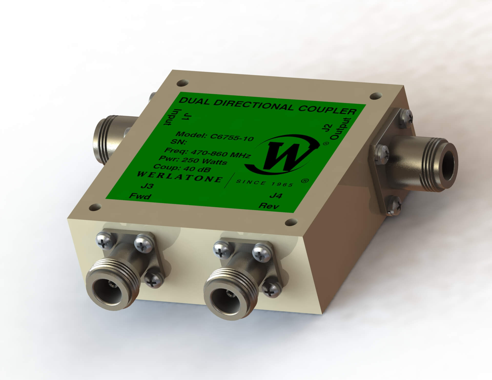 RF Coupler – Model C6755 – Dual Directional Coupler is a High Power design. The unit operates with 40 dB Coupling, covers the full 470-860 MHz band rated at 250 W CW. RF Coupler – Model C6755 supports military and commercial applications and operates with less than 0.2 dB of Insertion Loss and better than ± 0.3 dB of Coupling Flatness. The unit is available with a variety of mainline and coupled port connectors. Werlatone Directional Couplers are broadband Dual, Uni, and Bi-Directional. Above all, our high power designs tolerate the most harsh operating conditions associated with military and EMC testing environments.