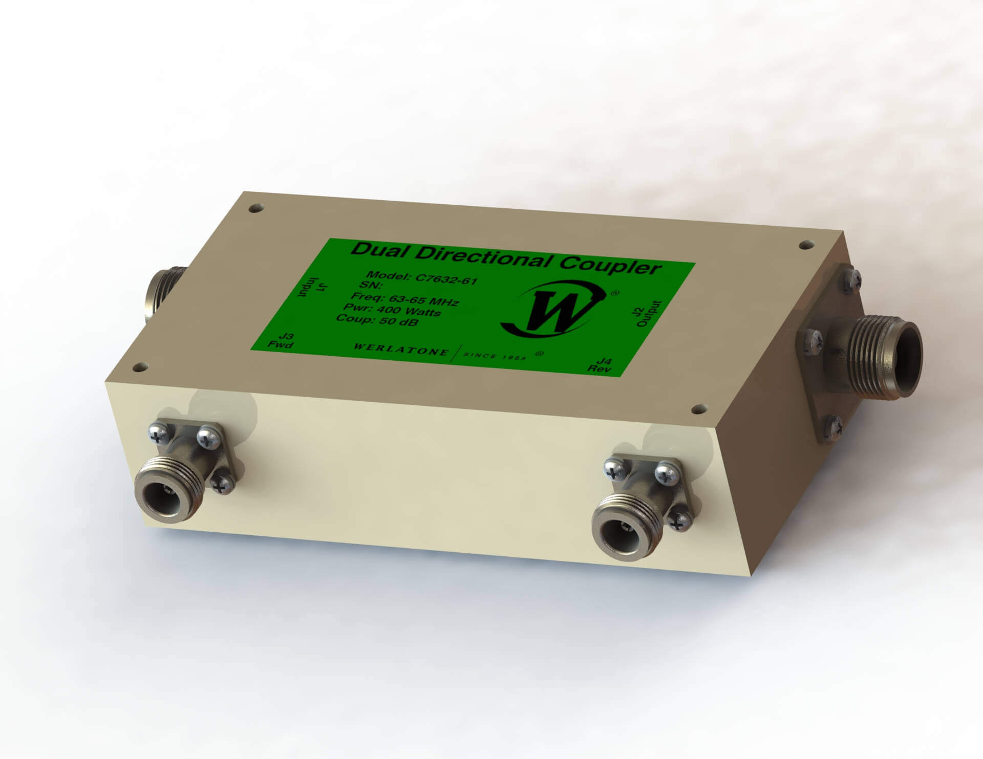 RF Coupler – Model C7632 – Dual Directional Coupler is a High Power design. The unit operates with 50 dB Coupling, covers the full 63-65 MHz band rated at 400 W CW. RF Coupler – Model C7632 supports military and commercial applications and operates with less than 0.15 dB of Insertion Loss and better than ± 0.3 dB of Coupling Flatness. The unit is available with a variety of mainline and coupled port connectors. Werlatone Directional Couplers are broadband Dual, Uni, and Bi-Directional. Above all, our high power designs tolerate the most harsh operating conditions associated with military and EMC testing environments.