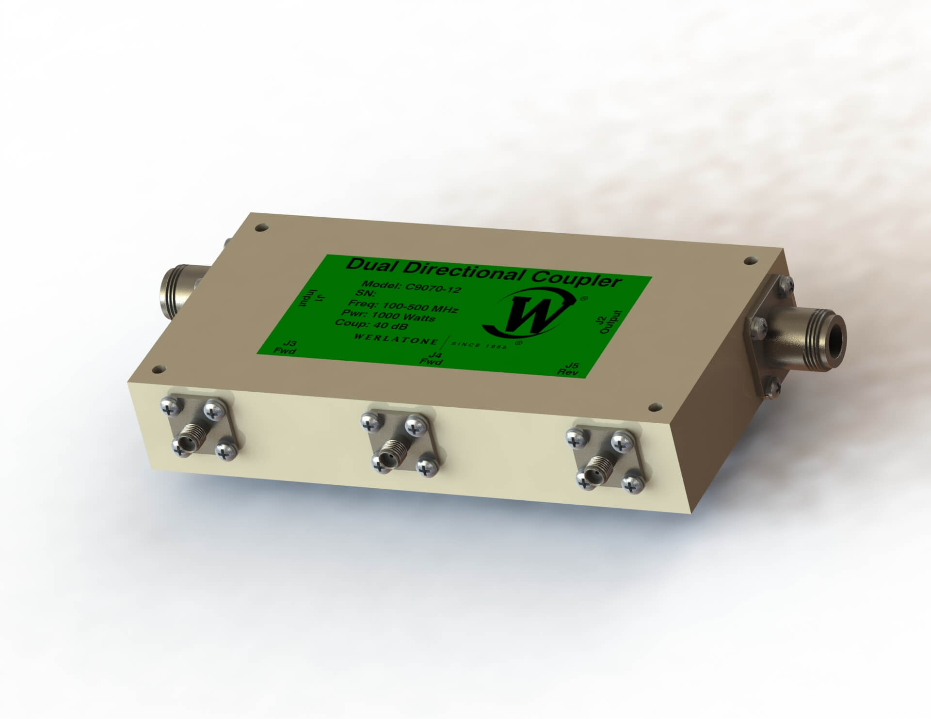 RF Coupler – Model C9070 – Dual Directional Coupler is a High Power design. The unit operates with 40 dB Coupling, covers the full 100-500 MHz band rated at 1000 W CW. RF Coupler – Model C9070 supports military and commercial applications and operates with less than 0.3 dB of Insertion Loss and better than ± 0.5 dB of Coupling Flatness. The unit is available with a variety of mainline and coupled port connectors. Werlatone Directional Couplers are broadband Dual, Uni, and Bi-Directional. Above all, our high power designs tolerate the most harsh operating conditions associated with military and EMC testing environments.