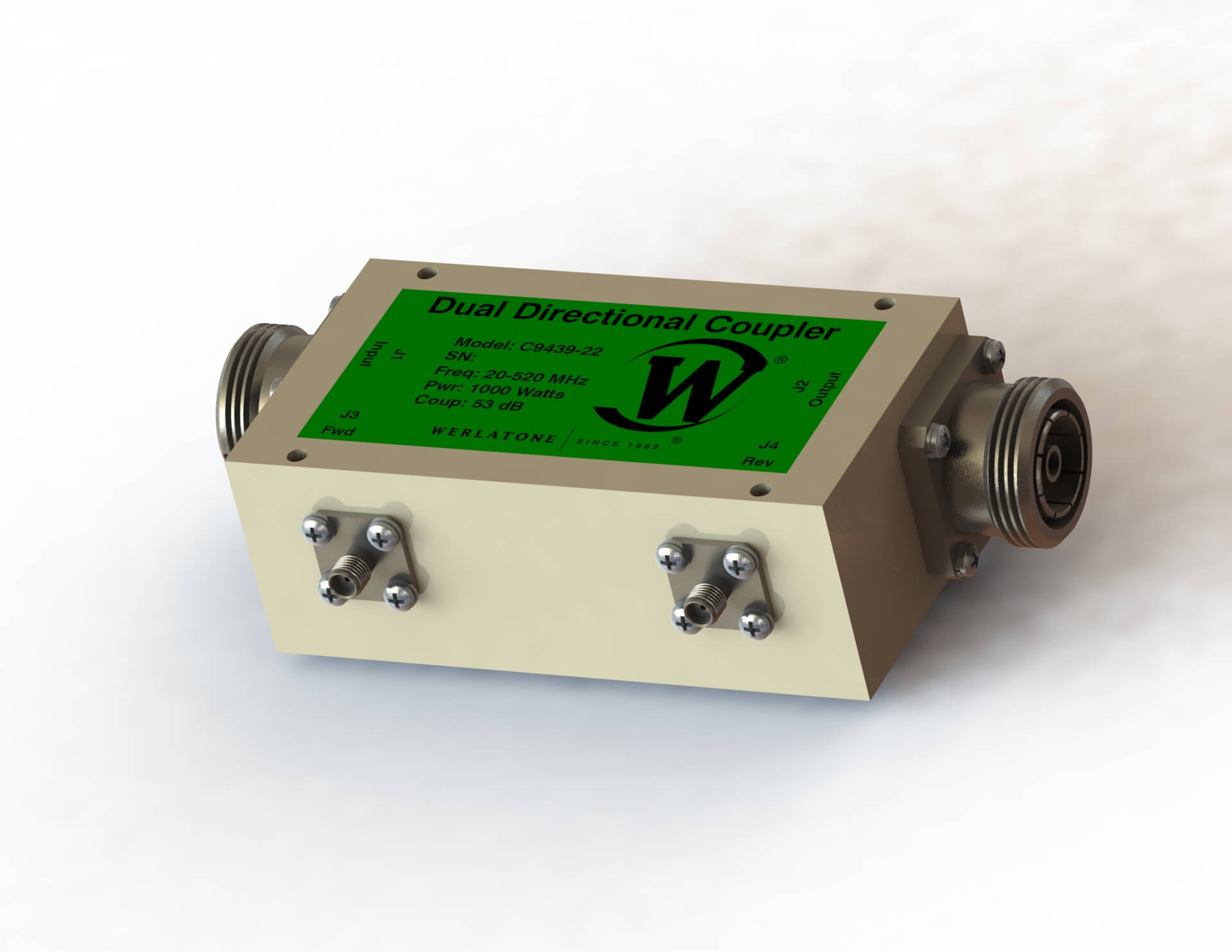 RF Coupler – Model C9439 – Dual Directional Coupler is a High Power design. The unit operates with 53 dB Coupling, covers the full 20-520 MHz band rated at 1,000 W CW. RF Coupler – Model C9439 supports military and commercial applications and operates with less than 0.3 dB of Insertion Loss and better than ± 1.0 dB of Coupling Flatness. The unit is available with a variety of mainline and coupled port connectors. Werlatone Directional Couplers are broadband Dual, Uni, and Bi-Directional. Above all, our high power designs tolerate the most harsh operating conditions associated with military and EMC testing environments.